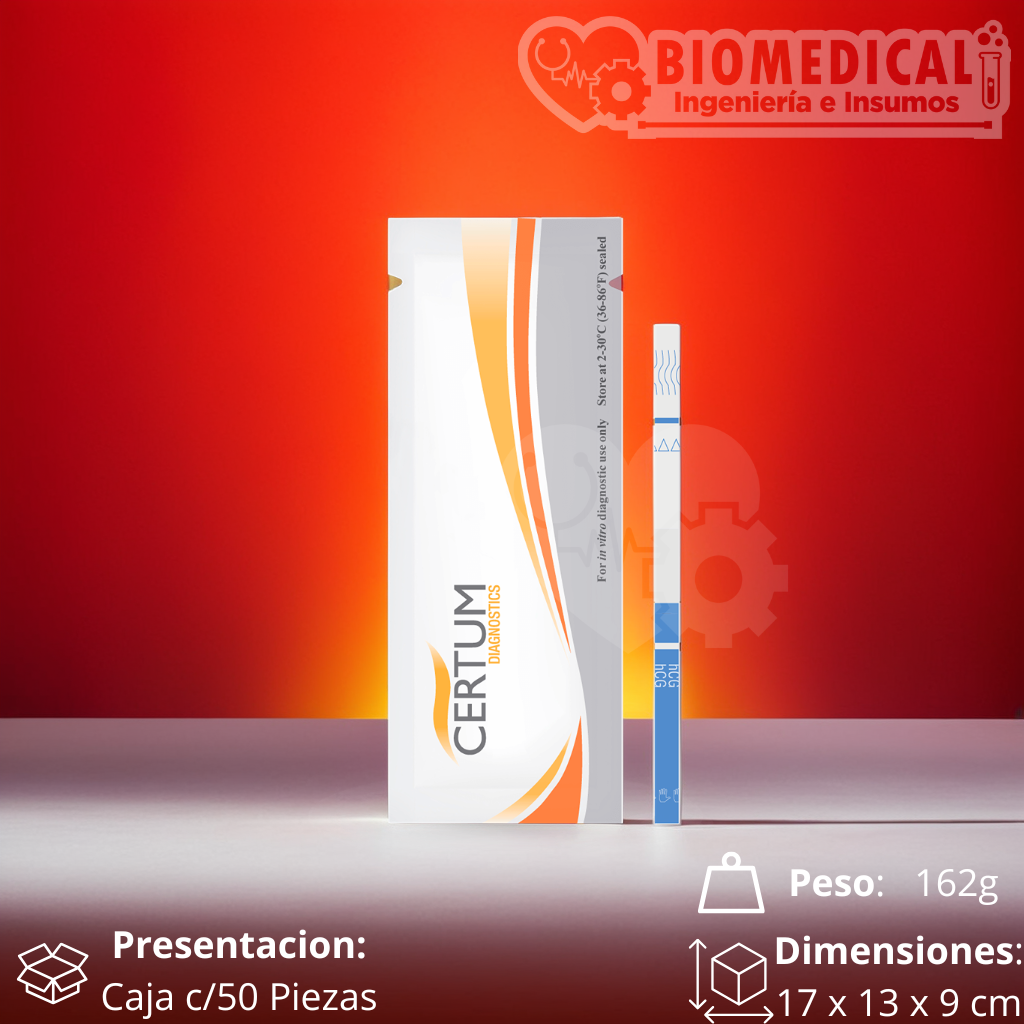 La Prueba de Embarazo (HCG) en Tira de la marca Certum es una herramienta confiable y fácil de usar para la detección temprana del embarazo. Este producto incluye 50 piezas en una presentación práctica, ideal para el diagnóstico clínico en laboratorios.