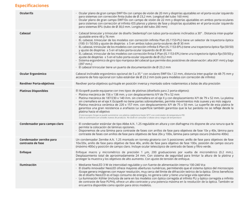 El microscopio iScope dispone de soluciones para la observación en contraste de fase, polarización, campo oscuro hasta 400x, campo oscuro con condensador cardioide (1000x) y Epi-fluorescencia. Dispone también de modelos múlti-cabezal. Y el Sistema de iluminación Smart Light Control (SLC) el cual recuerda la intensidad del objetivo anterior y así ya no es necesario ajustar la intensidad constantemente.